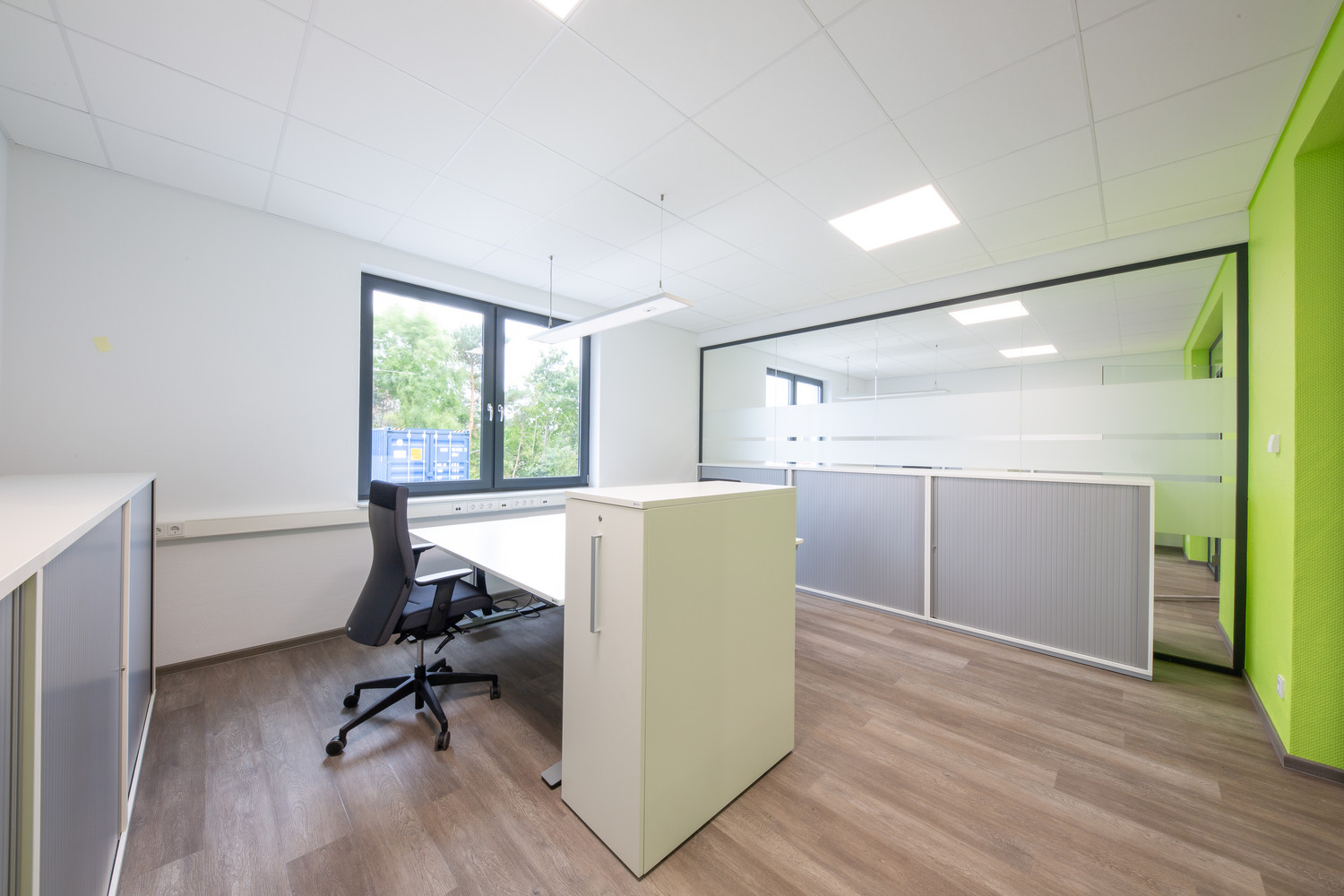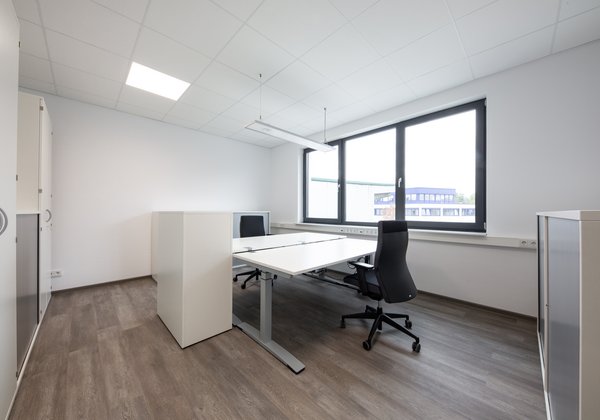 Um effektiv und gleichzeitig gesund zu arbeiten, werden höhenverstellbare Schreibtische eingesetzt. Schallabsorber gewährleisten zusätzlich die benötigte Ruhe für konzentrierte Abläufe.