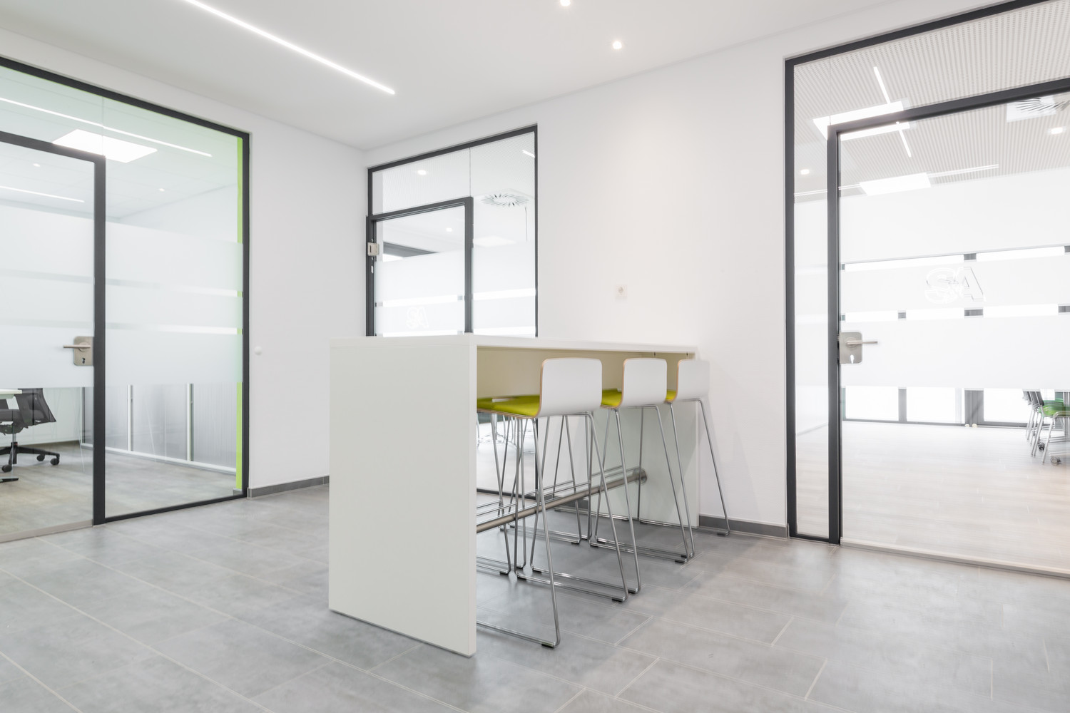 Der erste Eindruck bestätigt sich in jedem Stockwerk: Hier fühlt man sich wohl! Im Obergeschoss entstanden lichtdurchflutete und offene Büros. Durch Glaswände fällt ausreichend Licht in die Räume; die offene Küchenzeile sowie der dazugehörige Meeting Point, an dem wichtige Gespräche auch einmal im Stehen geführt werden können, laden zum Verweilen ein.