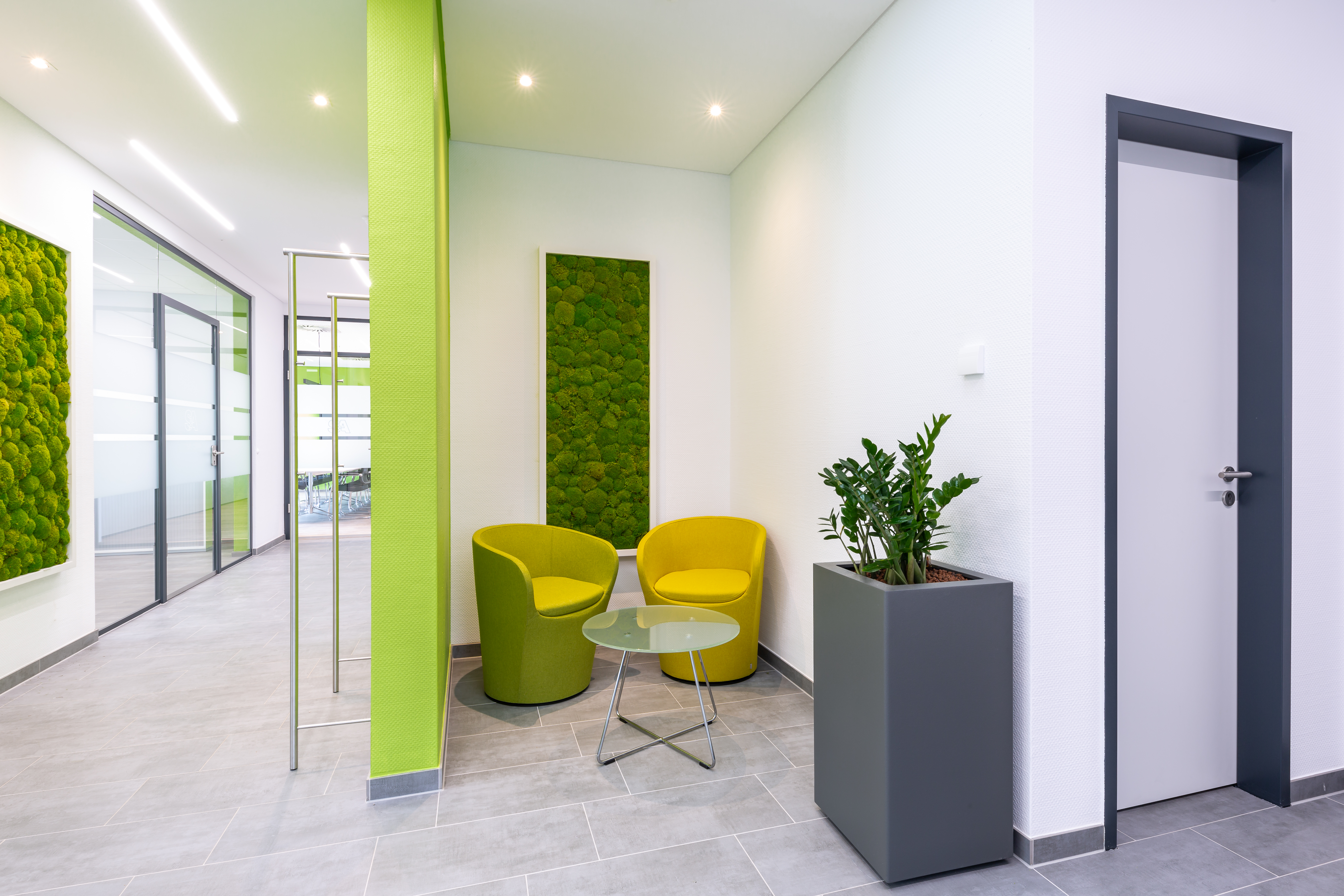 Für den Neubau kombinierten wir das Grün der Mooswände, die gleichzeitig für ein erfrischendes Arbeits- und Raumklima sorgen, mit modernen und schlichten Einrichtungselementen.