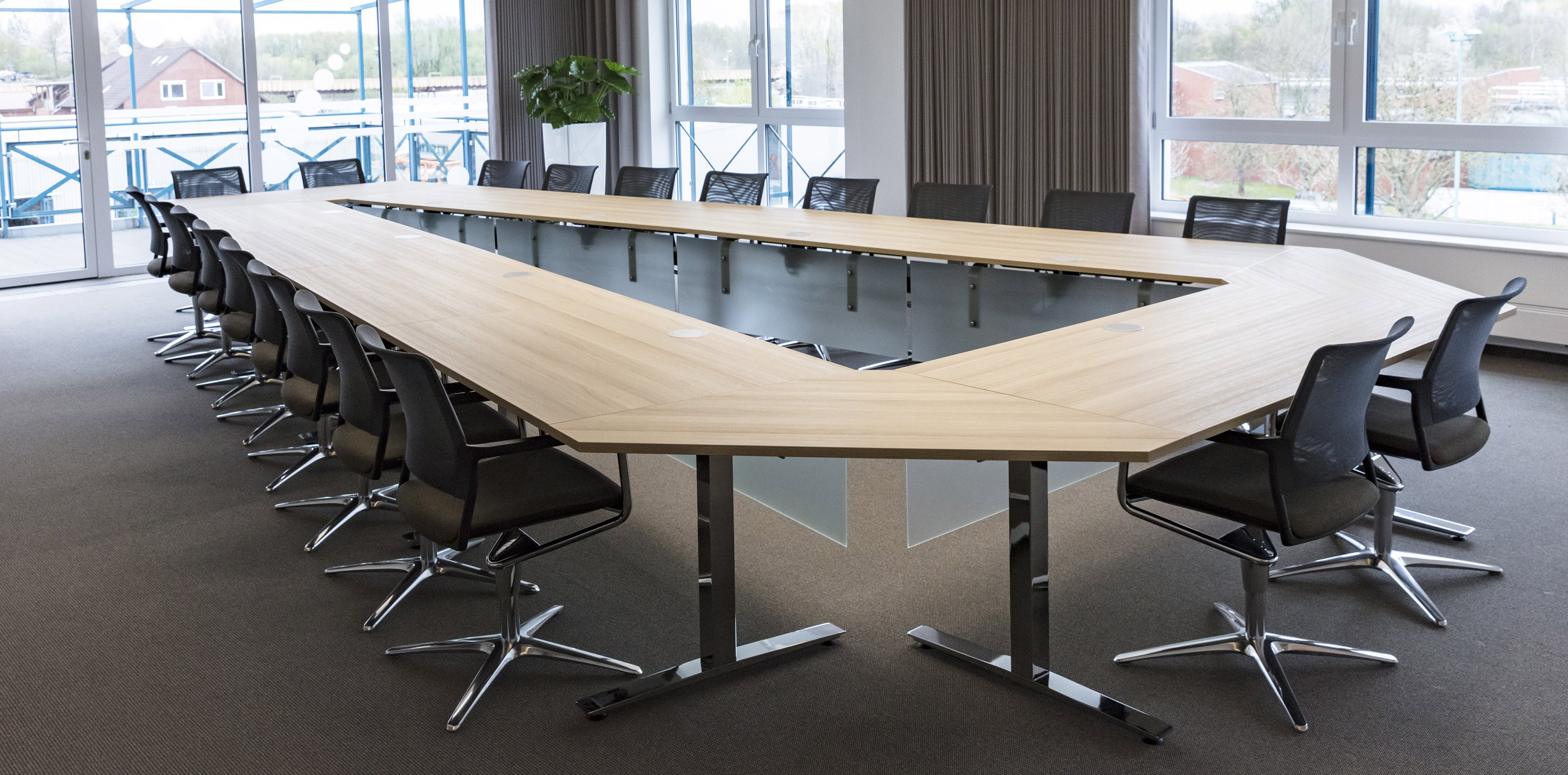 Der Konferenztisch aus Eiche überzeugt durch seine Größe, viele Sitzplätze, die individuelle Form mit satinierten Glas-Beinraumblenden und die vergrößerte Tischtiefe. Dadurch wird ein nutzerfreundlicher, gut erreichbarer und fast unsichtbarer Einbau der Steuerungselemente der modernen Medientechnik möglich. Eine ausgesprochen hohe Wertigkeit wird dem Massivholz-Tisch durch die vielen Chrom-Oberflächen des Gestells verliehen. Klarheit und Präzision bestimmen den Eindruck und bilden den optimalen Hintergrund für einen vielseitigen Austausch.